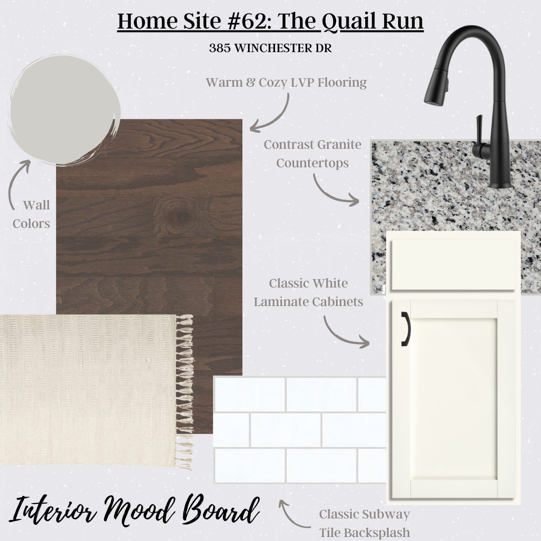 This stunning Quail Run floor plan home features 3 bedrooms and 2.5 modernly-appointed baths, perfect for growing families or those who seek a downsized lifestyle. Enjoy hosting friends and family in the roomy, open-concept great room, dining area, and large kitchen island, all tailored for a seamless and comfortable living experience. This beautiful home is fitted with elegant granite countertops, and LVP flooring throughout the main living areas with plush carpets in the bedrooms. The bathrooms and laundry room have beautifully tiled floors, with a modern walk-in shower in the master.